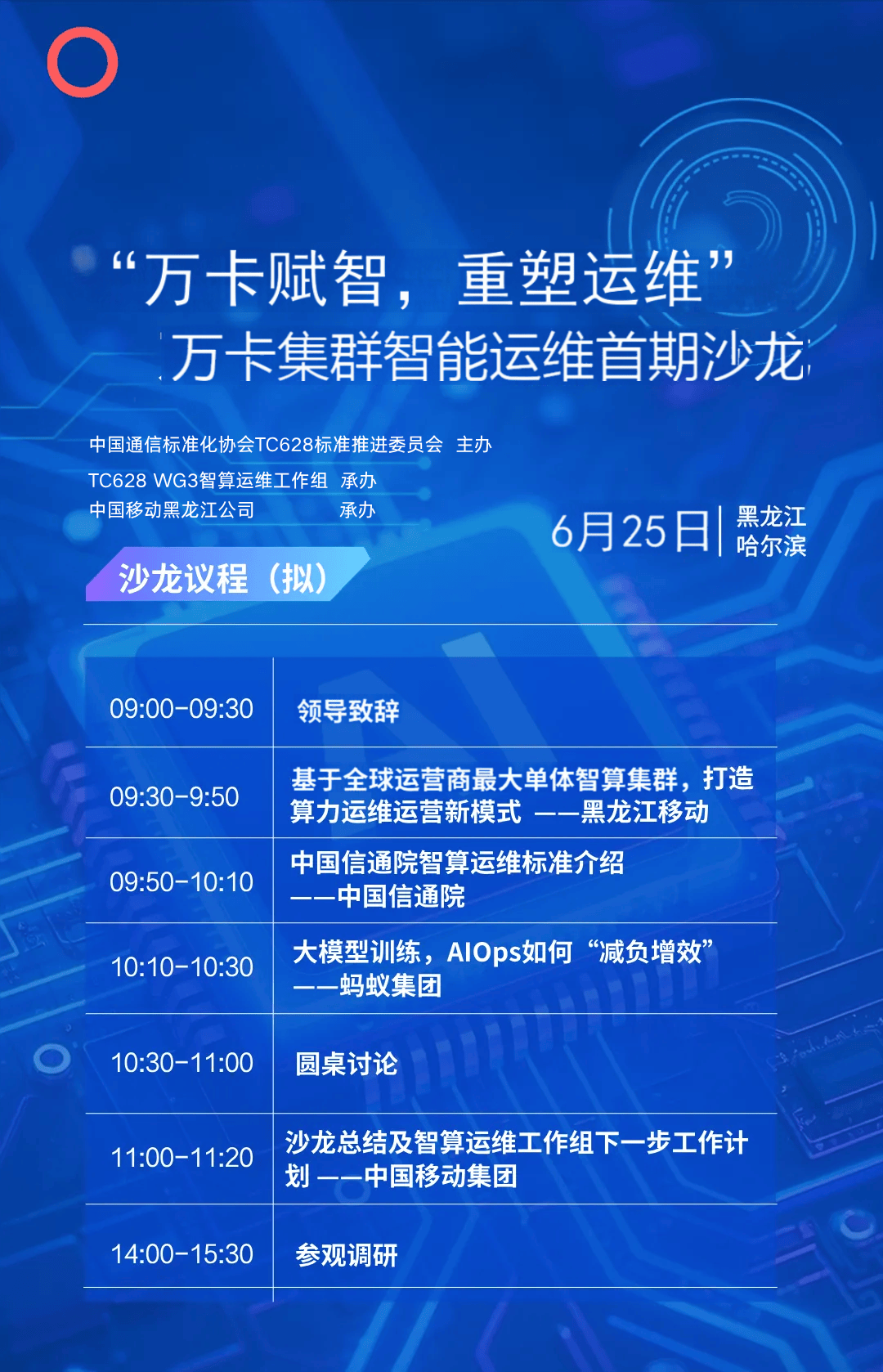 在此背景下,由中国通信标准化协会TC628标准推进委员会主办,TC628 WG3智算运维工作组(组长单位:中国移动集团网络事业部)与中国移动黑龙江公司共同承办的“万卡赋智,重塑运维” ——万卡集群智能运维首期沙龙,计划于6月25日在黑龙江哈尔滨举行。本次沙龙将重点聚焦“AIGC时代智算运维服务的范式重构与变革”,旨在探讨如何通过AI技术驱动、跨层跨域协同优化等,构建全栈一体协同的新型智算运维模式,加速建设“全域全时全场景”AI应用生态,深化技术普惠,全面释放新质生产力动能,更好服务赋能实体经济发展。