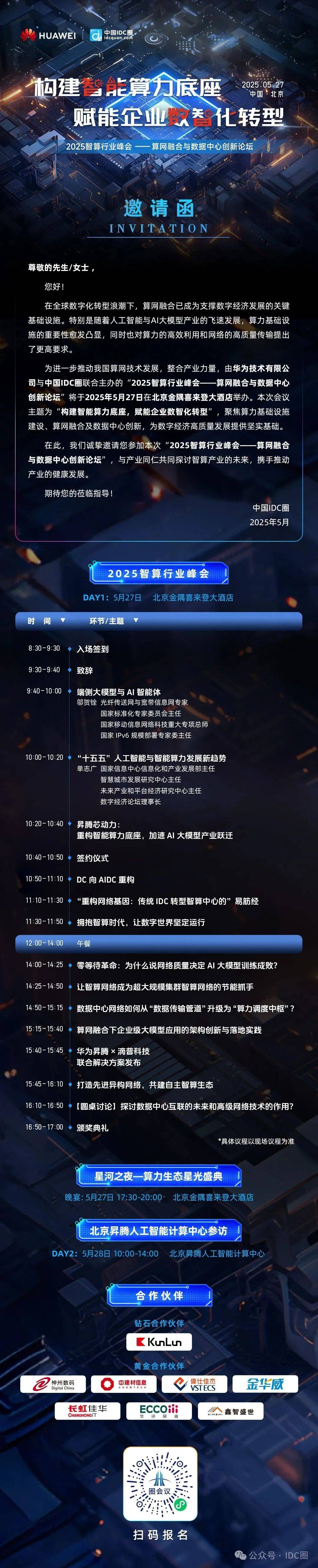 为了更好的联合产业上下游,打造完善的智算生态,推动算网融合技术发展,由华为技术有限公司中国IDC圈联合主办的“2025智算行业峰会——算网融合与数据中心创新论坛”将于2025年5月27日在北京举办,诚邀产业各界从业者共同参与,携手推动我国智算产业发展。